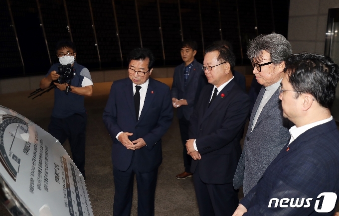 (제주=뉴스1) 강승남 기자 = 더불어민주당 당 대표 후보로 나선 김부겸 전 의원이 25일 오전 제주시 봉개동 제주4·3평화공원을 참배하고 위령제단에 헌화·분향한 후 위패봉안소에 들러 양조훈 제주4·3평화재단이사장으로부터 제주4·3 당시 피해상황에 대한 설명을 듣고 있다.2020.97.25/뉴스1