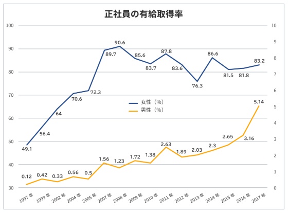 育休の男女別取得率(正社員)を見てみると、女性が8~9割の高率で推移しているのに対して、男性は地を這うような低さです。昨今急速に数字が伸びたとはいえ、その割合は5%超。しかし実際はそこまでも行っていないと私は見ています。