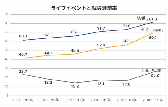 もう一つ、こんなデータも見てください。昨今では正社員であれば女性でも、結婚や出産の後も仕事を続けているというデータです。