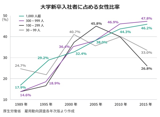さらにもう一つ。前回も引用した、大学新卒者に占める女性の割合のグラフです。2000年以降、どんどん高まっています。とりわけ、大手中堅企業でその数字はぐんぐん伸び、今ではほぼ男女半々になっているのが分かるでしょう。