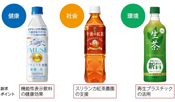 健康面の旗艦商品として、免疫活性化の効果をうたった機能性表示飲料「イミューズ」を位置付けた。社会面の旗艦商品は、「午後の紅茶」である。同社はスリランカ紅茶農園に対してレインフォレスト・アライアンスの認証取得を支援しており、地域社会との共生に力を入れている。環境面の旗艦商品が緑茶ブランド「生茶」だ。100%再生樹脂を使用したペットボトルを採用し、リサイクルの取り組みをアピールしていく。