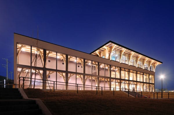「鉄骨と木造の屋根で大きな空間を形づくった内観」(安井昇さん)に加え、外観も「木材が積層されたようで造形的に美しい」(野原邦治さん)。
