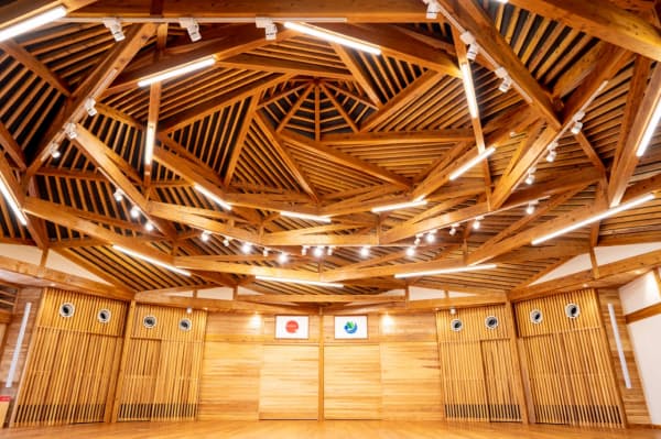 「短い材を組み合わせて大きな空間を構成」(腰原幹雄さん)しているのが特徴で「木材の軽快さを地域の材で表現した」(大橋さん)。多目的ホールの天井などは「木の架構をデザインとして見せる工夫」(野原さん)がある。
