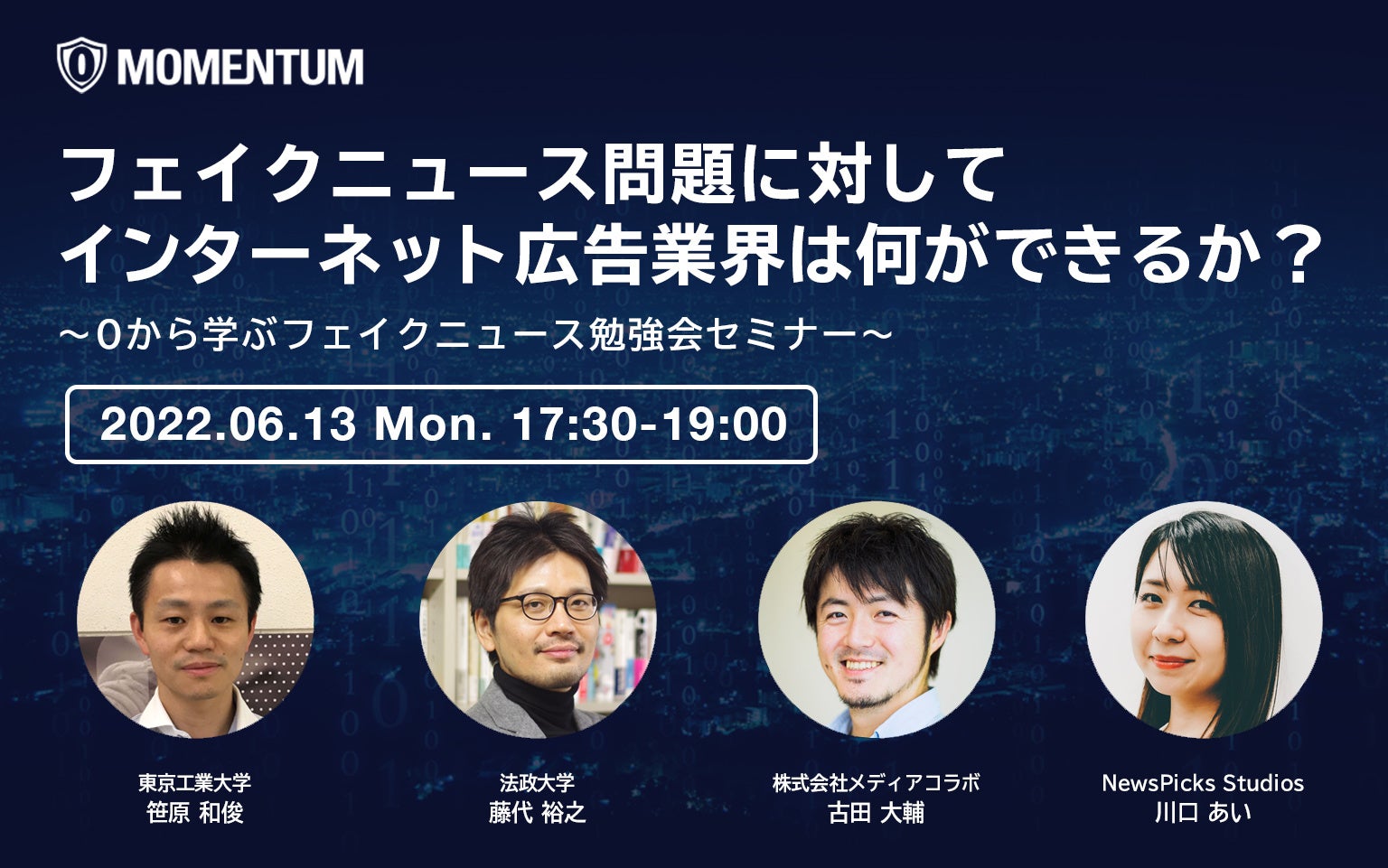 このような問題意識のもと、インターネット広告の健全化に取り組むMomentum株式会社が主催者となり、専門家をお招きし、講演やディスカッションを行います。フェイクニュース問題と広告の関わりについて考えるものさしをご提供できればと思います。