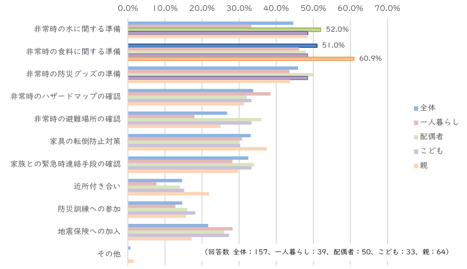 ・防災について具体的な行動をしていると回答した人は31.0%。その中でも2人に1人が「非常時の食料」と回答。配偶者やこどもと一緒に暮らしているという人の回答では、「非常時の水」が最多に。