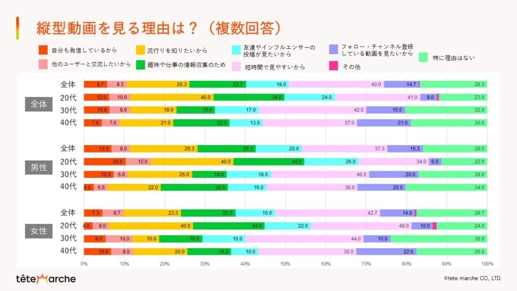 Instagramは2020年8月に『Reels』、YouTube は2021年9月に『shorts』がリリースされ、ユーザーの縦型動画に対する注目は年々高まりを見せています。企業向けSNSマーケティング支援を中心としたビジネス展開をする「テテマーチ株式会社」が首都圏在住の 20 代〜40 代の男女に【SNSの縦型動画に関する意識】についてのアンケート調査を実施したところ、縦型動画を見る理由について約40%が「短時間で見やすいから」とし、「流行を知りたい、情報収集のため」と答えた人は全体の約50%となりました。
