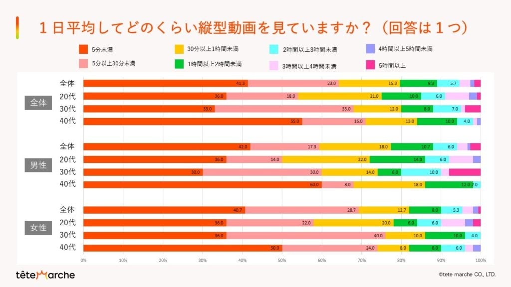 1日の縦型動画の視聴時間については、特に20代女性と30代男性は【3時間以上】が10%となり、長時間視聴しているユーザーが多く、縦型動画が注目されている結果となりました。